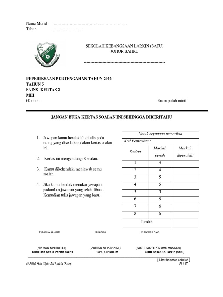 Contoh Soalan Peperiksaan Pertengahan Tahun Sains Tahun 5 Scribd